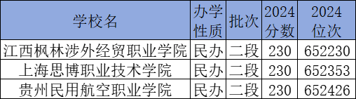 230分能上的大学中民办性质的有江西枫林涉外经贸职业学院、上海思博职业技术学院、贵州民用航空职业学院。