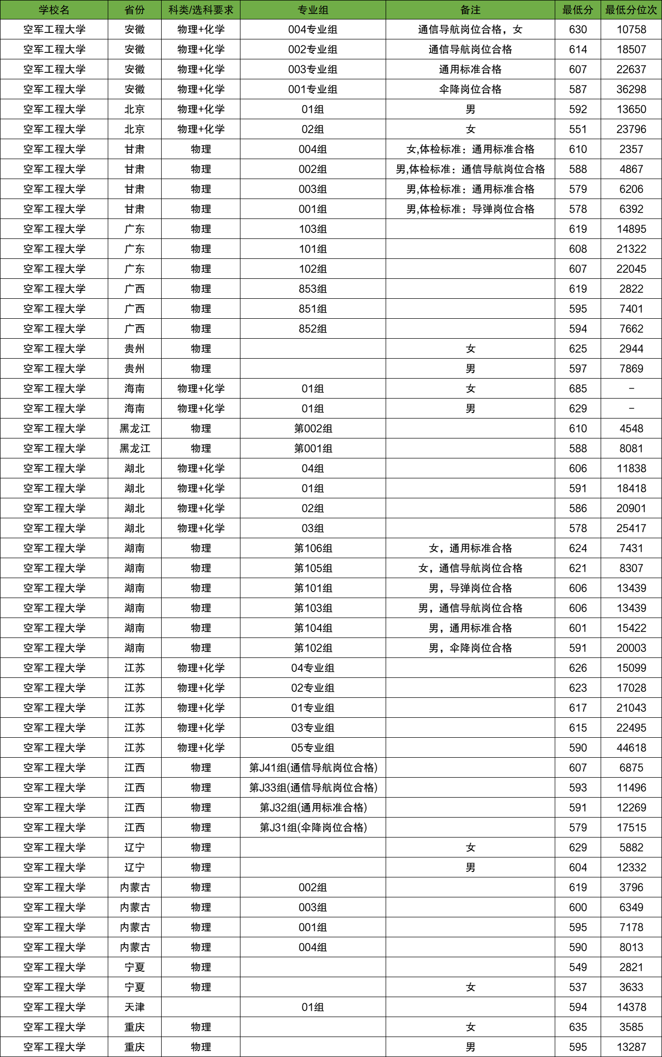 2025年空军工程大学录取分数线部分省份已公布,安徽本科提前批物理类最低587分;广东本科提前批物理类最低607分;更多省份具体录取分数线详情见下文。
