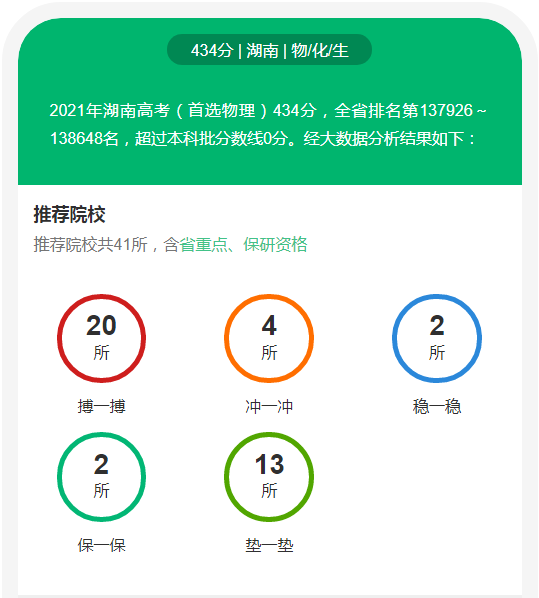 湖南省的院校专业组志愿填报过程中,要按照合理的分数梯度进行安排,各位湖南考生可以参考“搏冲稳保垫”的顺序,可以很大程度上避免滑档。