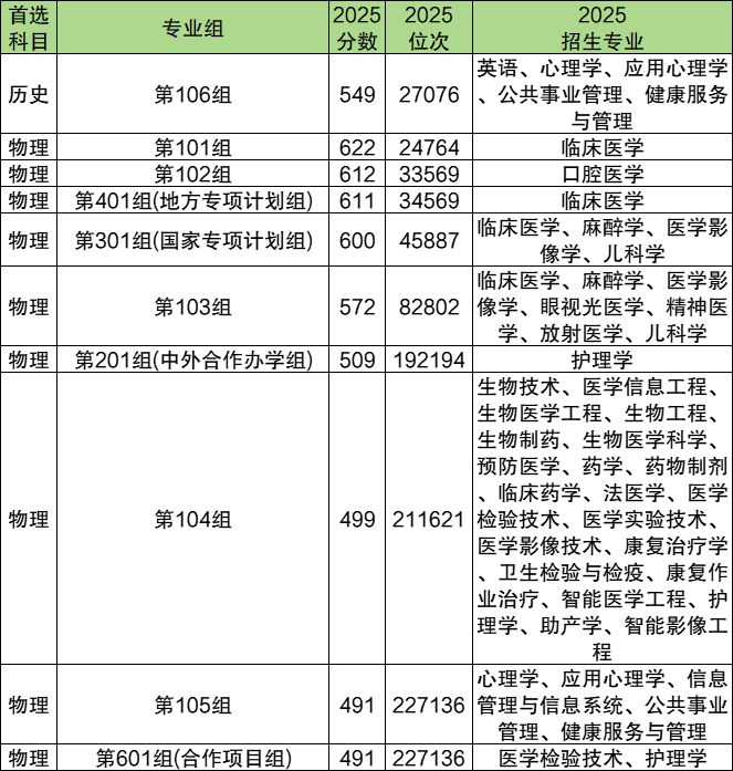 而物理类各专业录取分数线是491分到622分,收分最高的专业为临床医学,2025年最低分622分,位次排名是24764名;分数线排名较高的还有口腔医学(612分),临床医学地方专项(611分),临床医学、麻醉学、医学影像学、儿科学(国家专项)(600分)等,这些热门专业需600分及以上才能被录取。