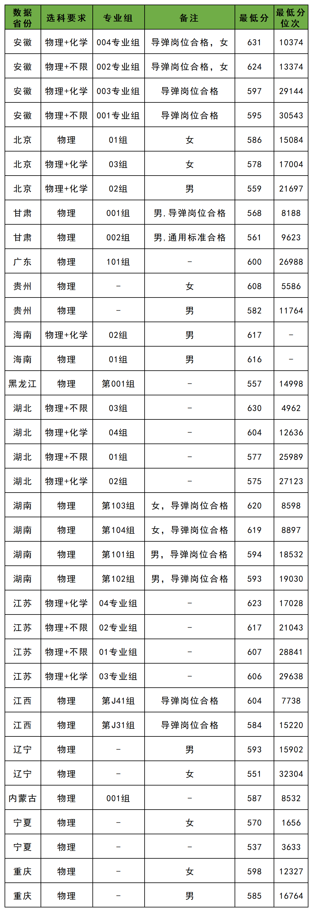如2025年火箭军工程大学在安徽省物理类招生最低分为595分。在海南招生最低分为616分。