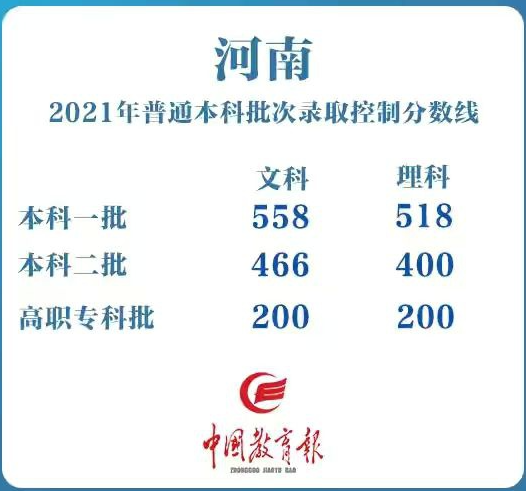 河南:本科一批文科558分,本科二批文科466分。