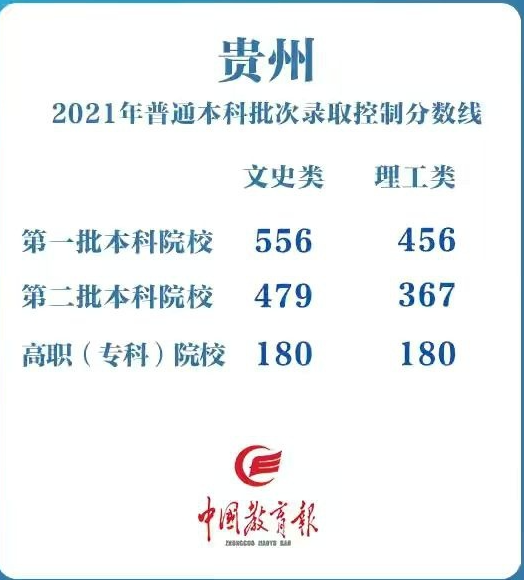 贵州:文科本科第一批556分、本科第二批479分。
