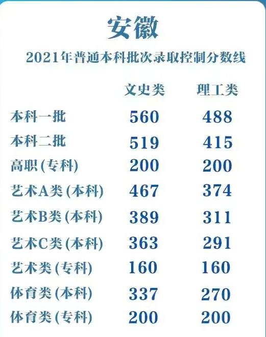 安徽:文科一本560分、二本519分