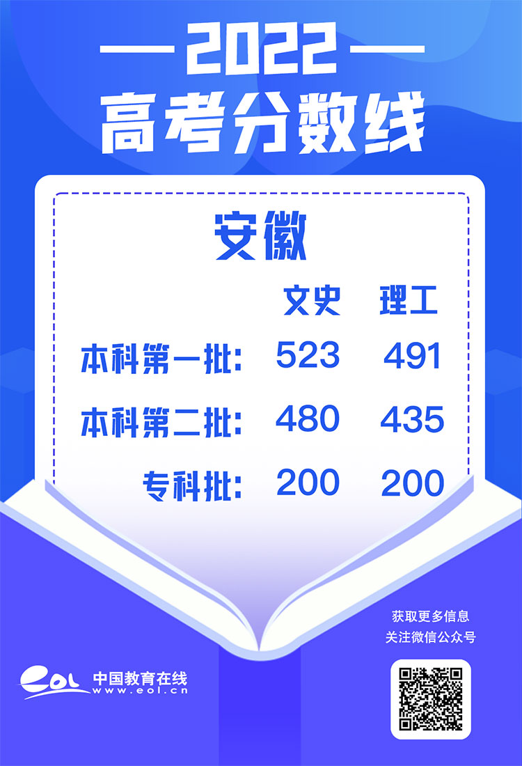 安徽:文科一本523分,文科二本480分