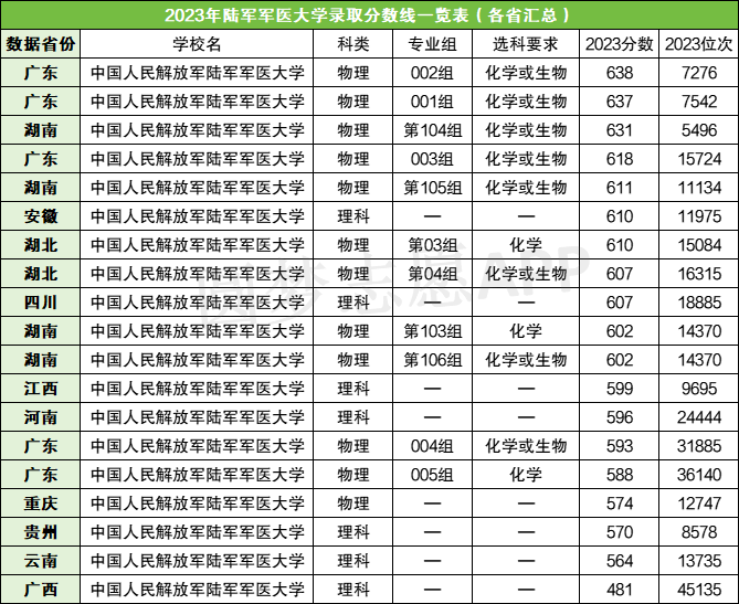 陆军军医大学每年在本科提前批和普通本科批都有招生,但并非面向所有省市招生。关于陆军军医大学2023年在部分省市普通本科批和提前批的分数线,详情如下: