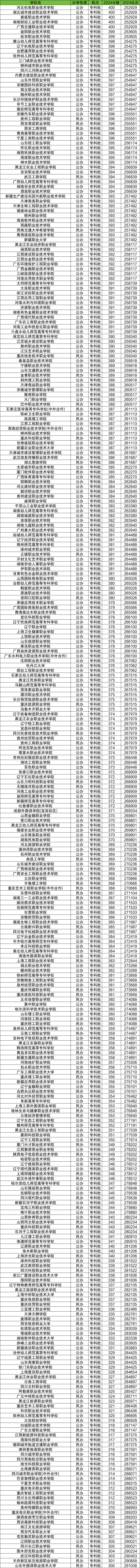 2024年文科录取分数线在300到400分能上的大学一共有457所,全部是专科批。