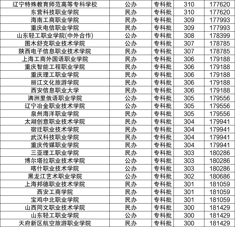 比较好的有长春师范高等专科学校(387分)和内蒙古建筑职业技术学院(359分),这些都是国家重点院校。分数线最高的有通化医药健康职业学院、上海科学技术职业学院、青岛职业技术学院、南京旅游职业学院、江苏财经职业技术学院,2024年最低分400分;分数线最低的有山西同文职业技术学院、山东轻工职业学院、天府新区航空旅游职业学院,2024年最低分300分。