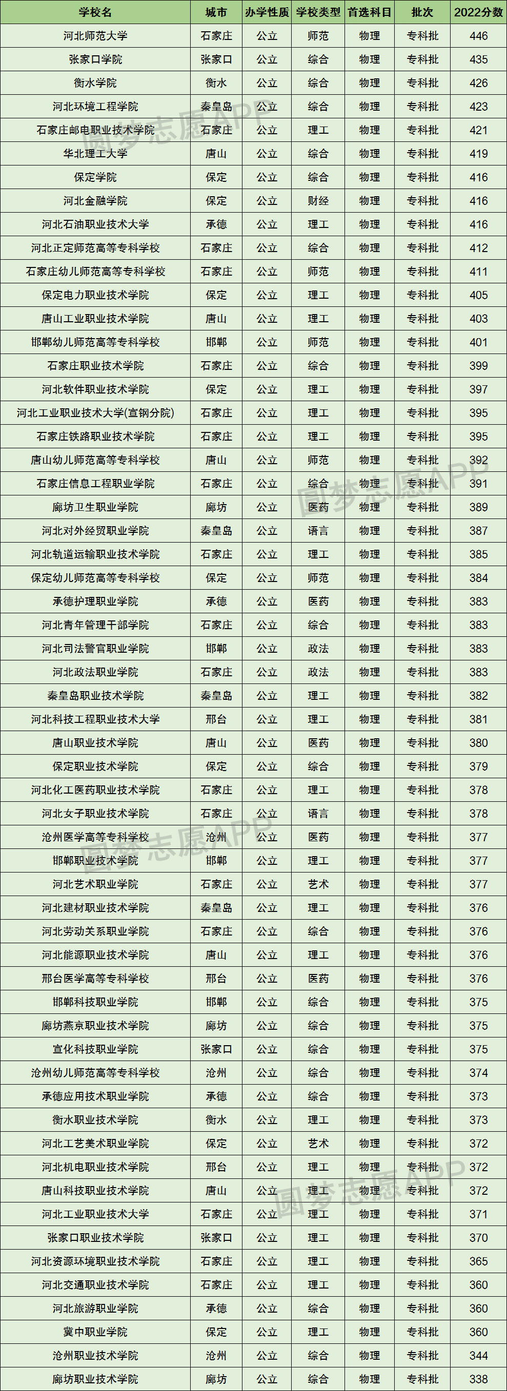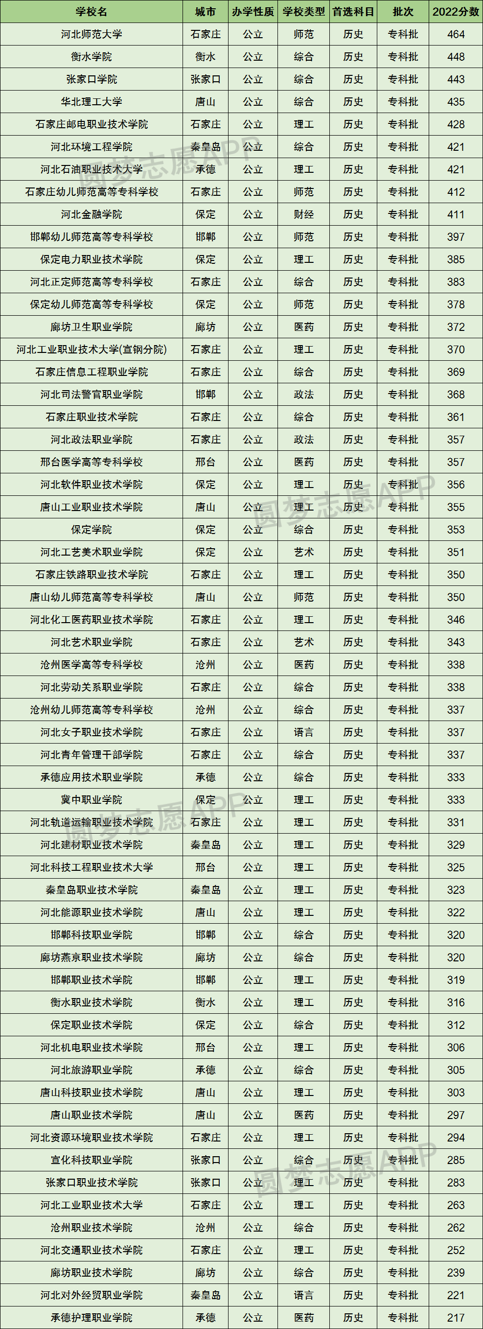 以下是小编根据圆梦志愿APP提供的数据,为大家整理出的河北省2022年所有专科学校分数线排名。