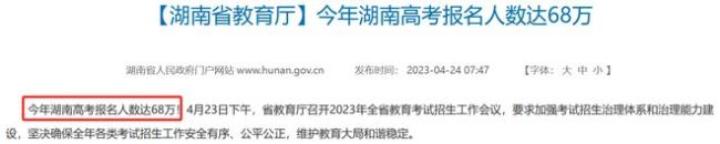 5月19日下午,湖南2023年全省普通高校招生考试安全工作电视电话会议召开,会议上布置各项工作,确保高考安全平稳顺利。会议上透露2023年湖南省高考报名人数共有68.4万人,相比上年增加1.27万人(首选物理的考生有30.93万人,占比60.68%;首选历史的考生有20.04万人,占比39.32%),;对口升学考试报名人数16.69万人,比上年增加1.49万人;少年班等其他考生约0.74万人,与上年基本持平。