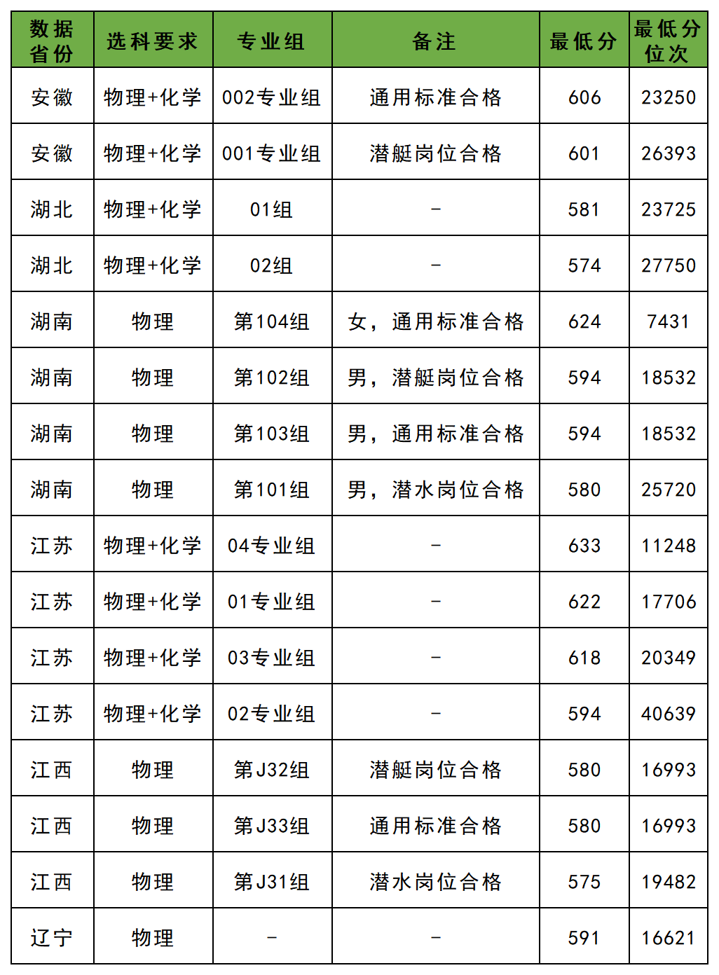 如2025年海军潜艇学院在辽宁省物理类招生最低分为591分。在湖北省物理类招生最低分为574分。