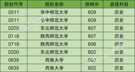 东北师范大学:602分、陕西师范大学:606分、西南大学:602分、华中师范大学:609分。
