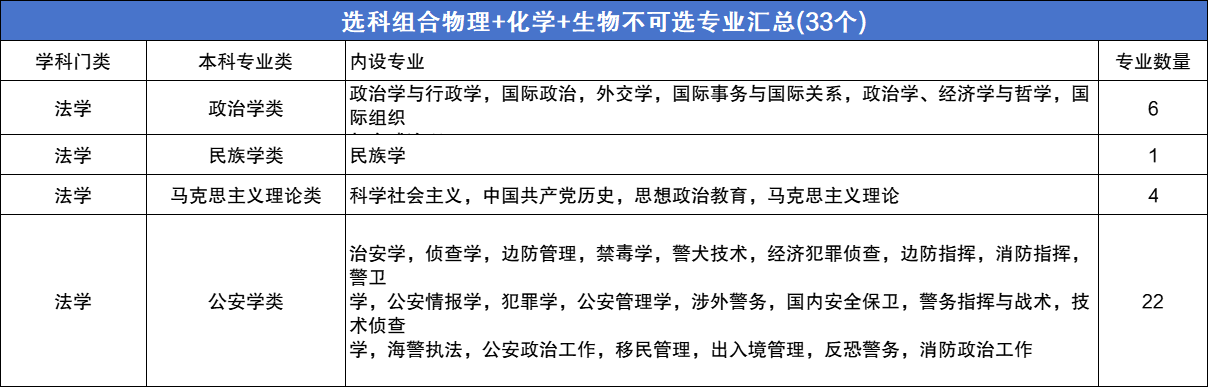 教育部选科要求显示,物化生不可报考的专业有33个,均为法学类专业,如治安学、侦查学、边防管理、外交学等专业不可报考。