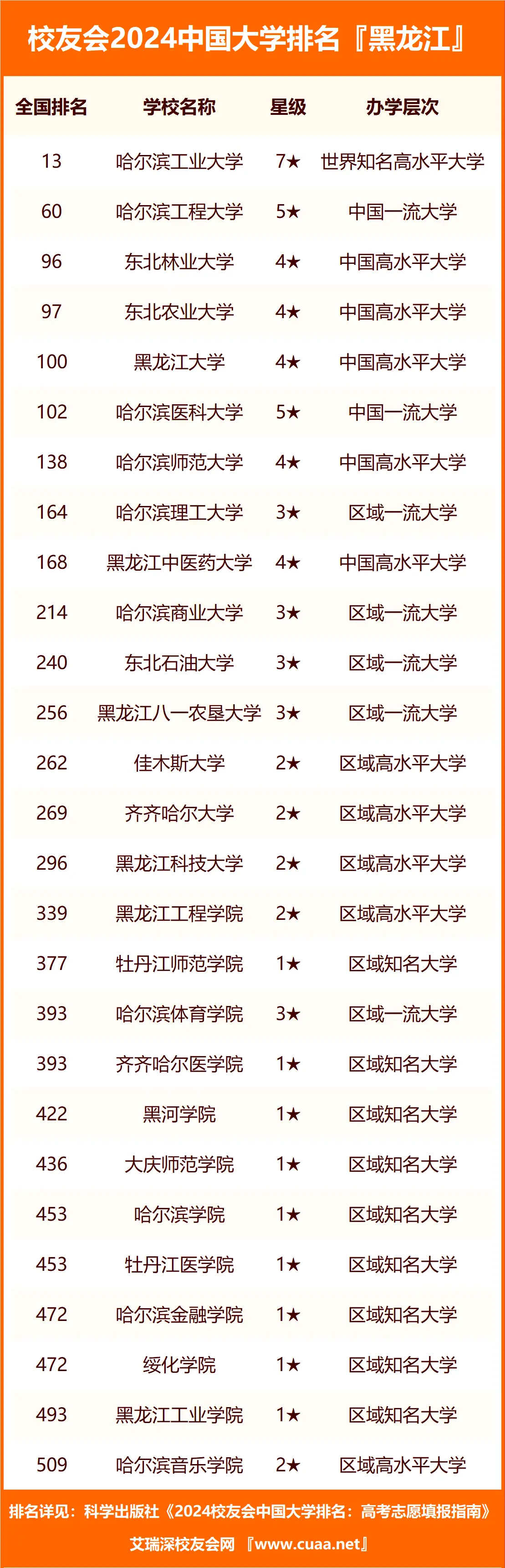 根据2024年校友会公布的中国大学排行榜来看,黑龙江公办本科大学排名前十名的是: