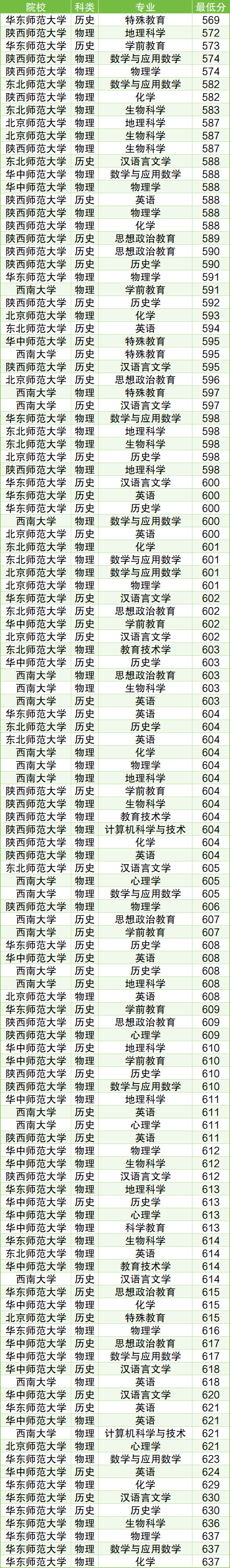 陕西师范大学物理类数学与应用数学(574分)、华东师范大学历史类学前教育(573分)、陕西师范大学物理类物理学(574分)、陕西师范大学物理类地理科学(572分)。
