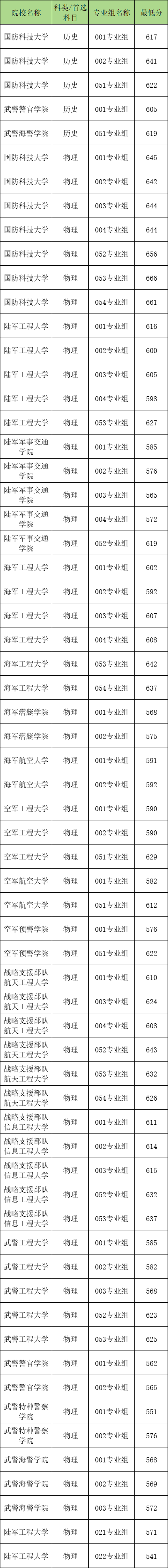 物理类组各个军校最低分数线是: