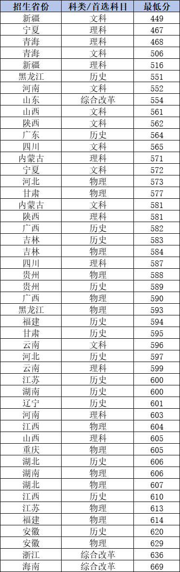考生高考成绩需达到所在省同批次录取控制线(合并批次省份按省级招生部门划定的最低分数线执行)。学校按各省招生计划,依据投档成绩从高到低择优录取,按分数优先原则分配专业。