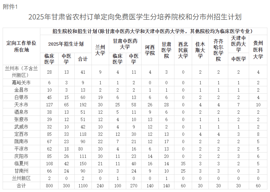 2025年订单定向培养医学大学生招生计划1100名,定点院校共9所。