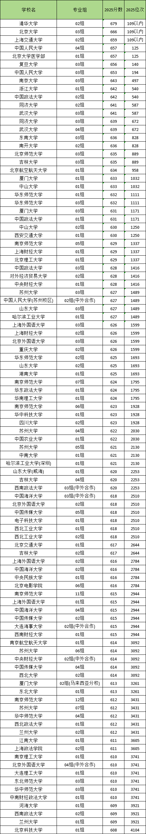 江苏省内收分最高的是南京大学643分,2025年投档最低位次为191名。