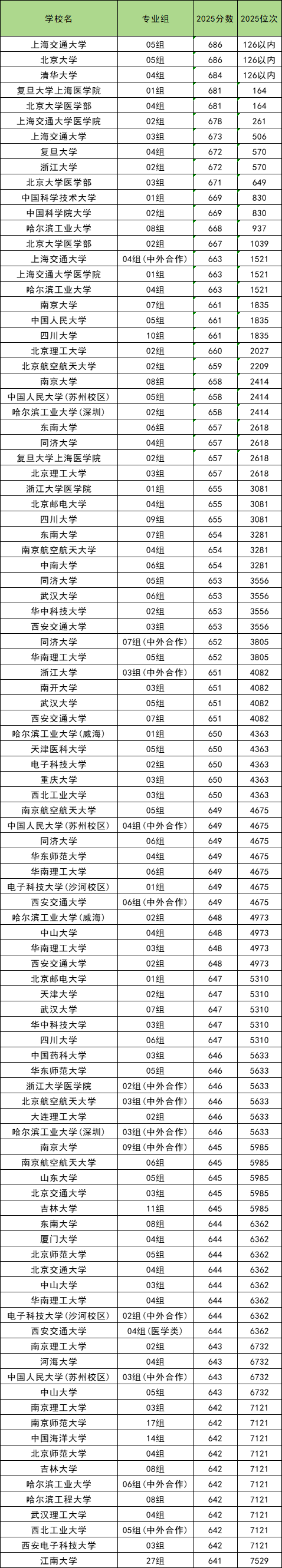 录取分数线最高的是上海交通大学686分,最高分专业为电子信息类,2025年投档最低位次126以内;排名前五的院校专业还包括:北京大学686分(126以内)、清华大学684分(126以内)、复旦大学上海医学院681分(164名)、北京大学医学部681分(164名)。