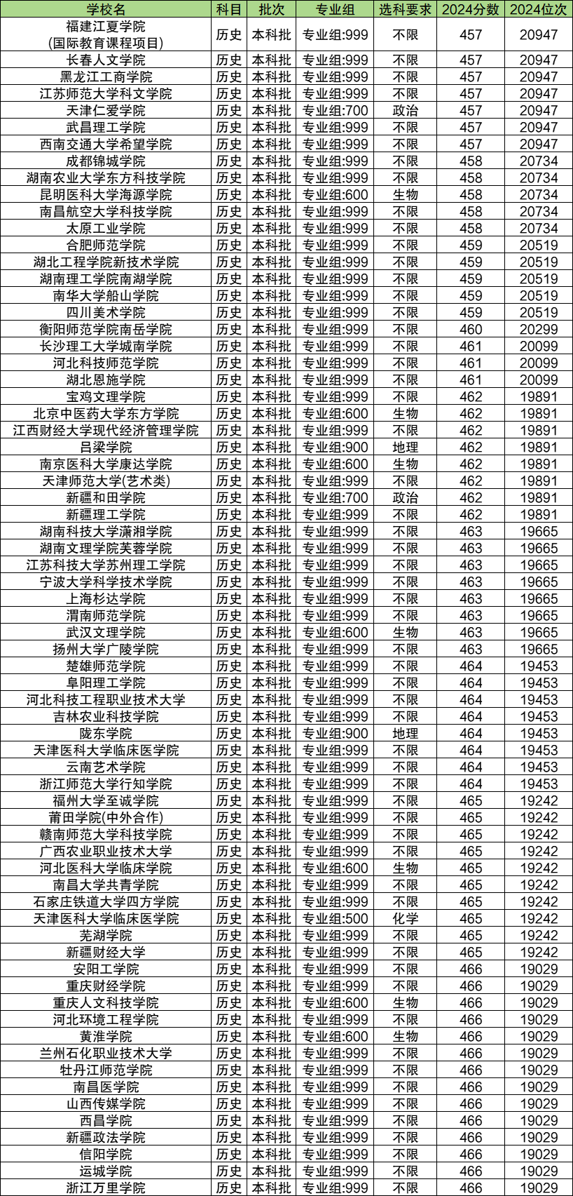 福建高考历史类2万名左右能报考的大学中位次排名较低的有长春人文学院999组、黑龙江工商学院999组、江苏师范大学科文学院999组等,2024年最低分457分,对应排名是20947名。另外最接近2万名的是长沙理工大学城南学院999组、河北科技师范学院999组、湖北恩施学院999组,2024年最低分461分,排名是20099名。