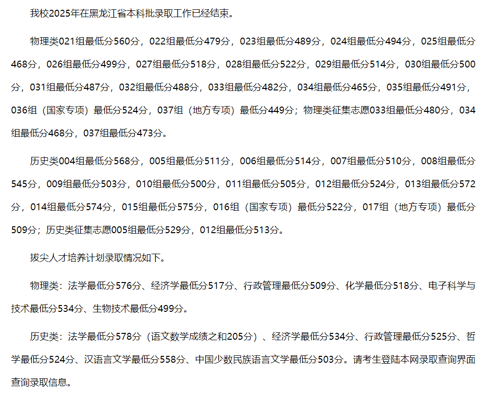 篇幅有限,本文仅整理了部分黑龙江本、专科院校2025年在省内招生的分数线一览表,更多院校分数可登录大学官网查询。