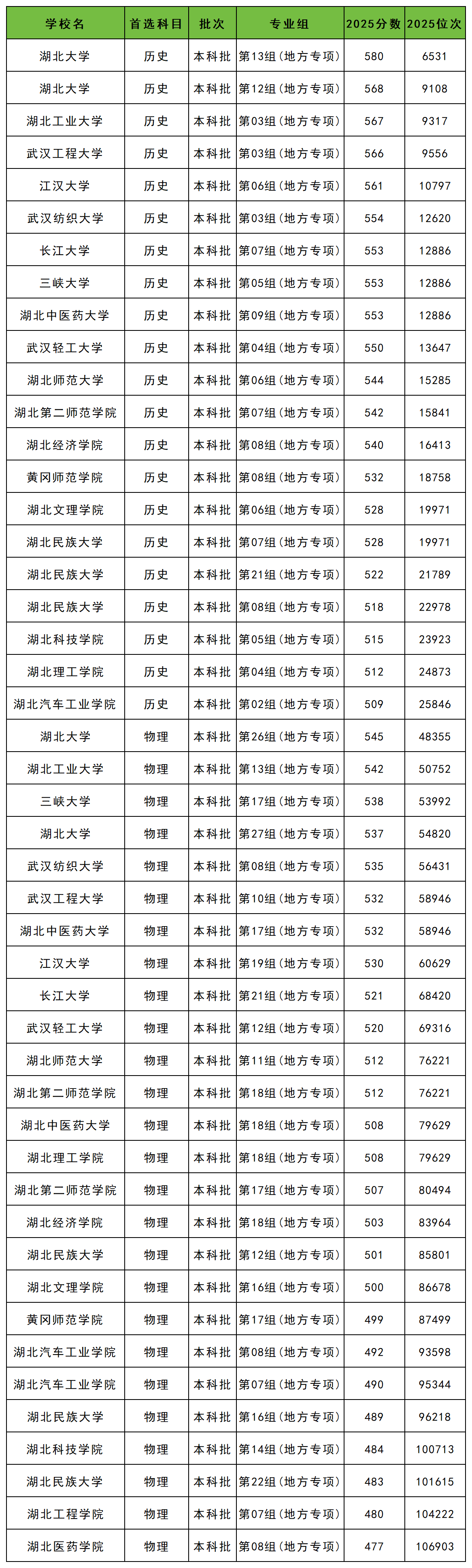 2025年湖北所有地方专项计划大学历史类录取分数线从509分到580分不等,其中分数线最低和最高的分别是:湖北汽车工业学院02组、湖北大学13组。