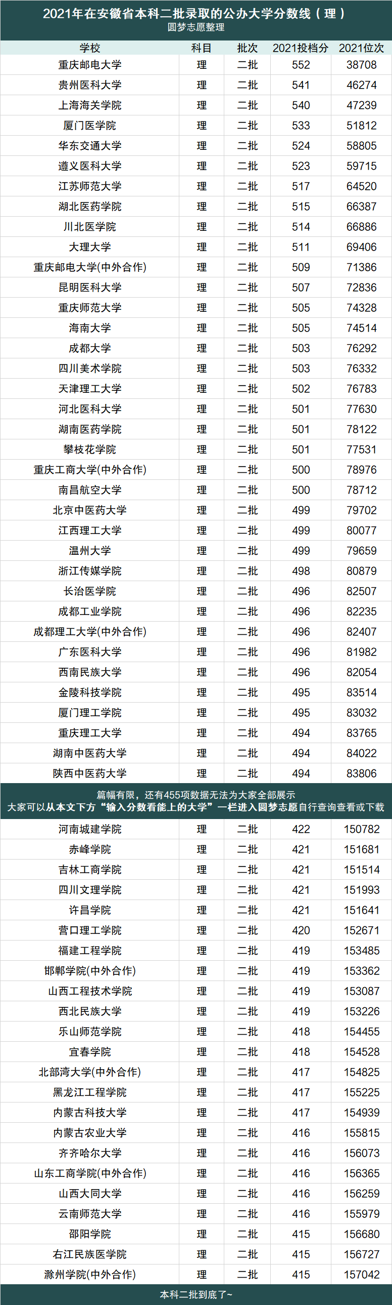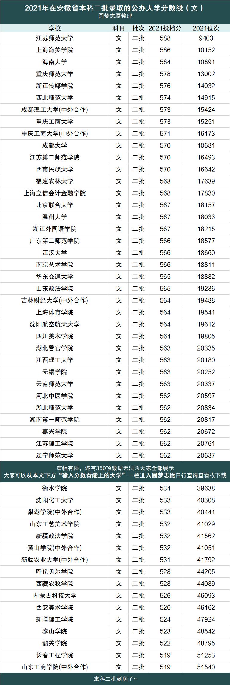 二. 全国公办大学在安徽本科二批录取分数及排名