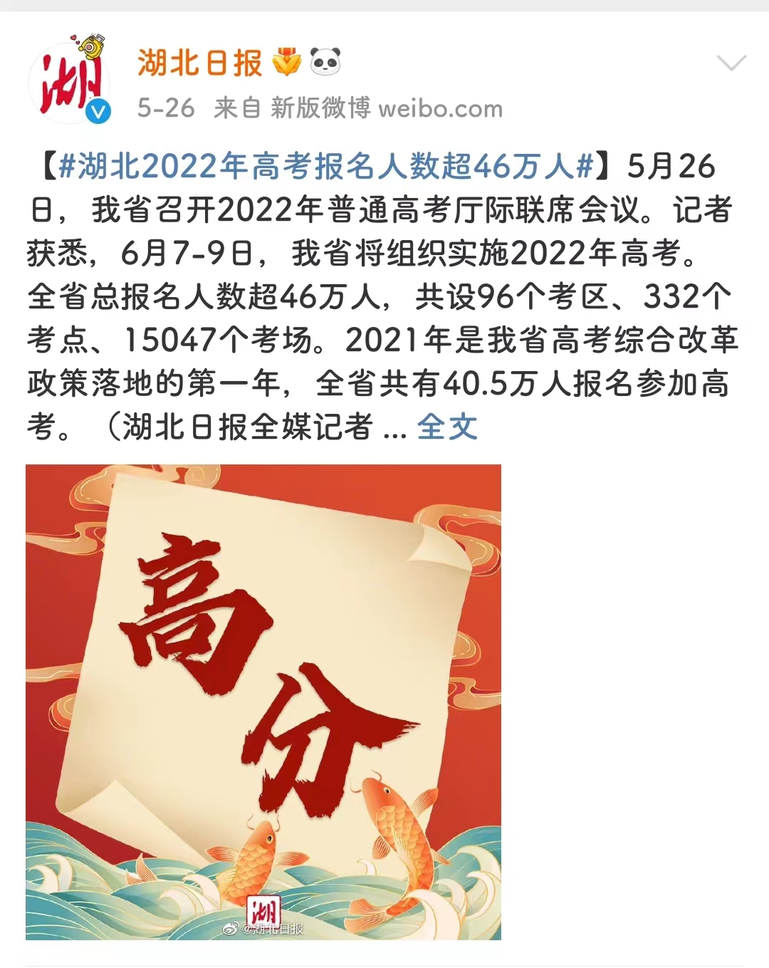 2022年湖北省高考报名人数超过46万人,相较于2021年增加5.5万人。