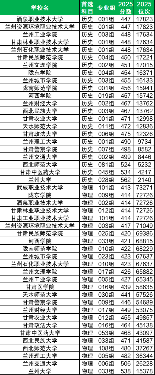 需要注意的是,2025年是甘肃新高考政策落地的第二年,批次线按照首选科目(历史/物理)直接划分本科线,因此如果要择校,同学们可以从办学水平、师资队伍、学习环境等方面区分院校层次。