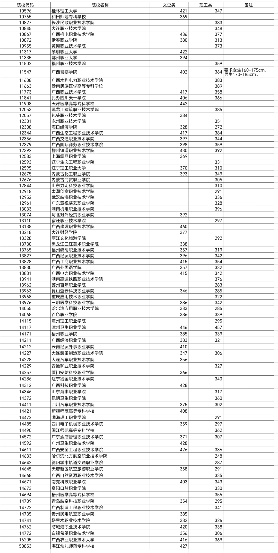广西高职高专普通批第一次征集志愿全国学校名单及分数线如下图