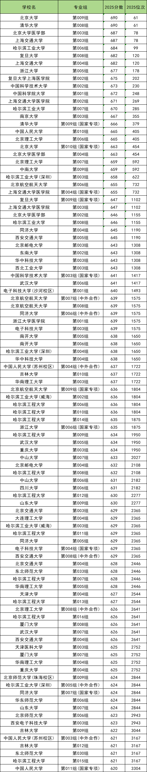 录取分数线最高的是北京大学690分,最高分专业组为第009组,2025年投档最低位次61名;排名前五的院校专业还包括:清华大学690分(61名)、北京大学医学部687分(78名)、上海交通大学687分(78名)、哈尔滨工业大学684分(99名)。