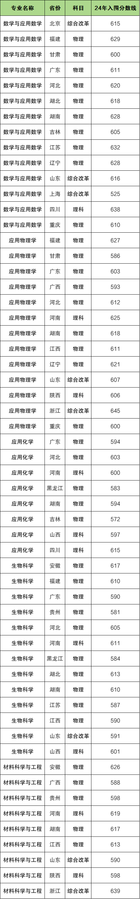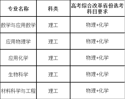 2024年中南大学强基计划招收专业为:数学与应用数学、应用物理学、应用化学、生物科学、材料科学与工程。各招生专业与选考科目要求如下图所示。