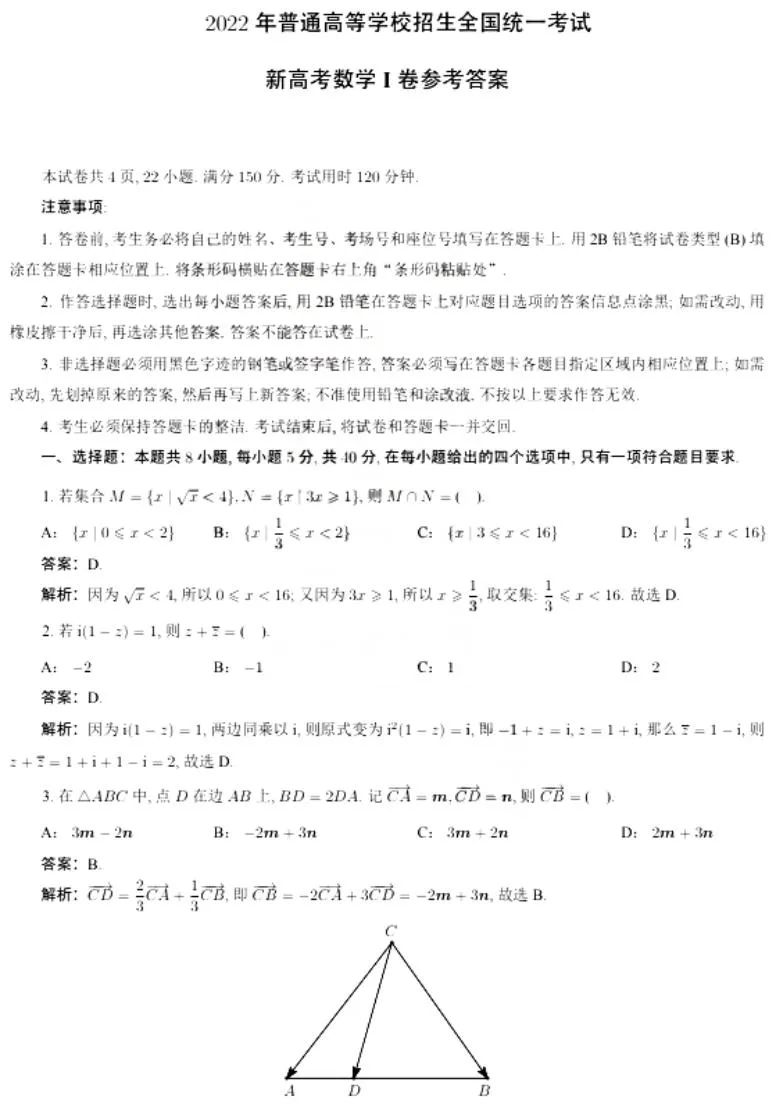二. 2022全国新高考一卷数学试卷及答案汇总