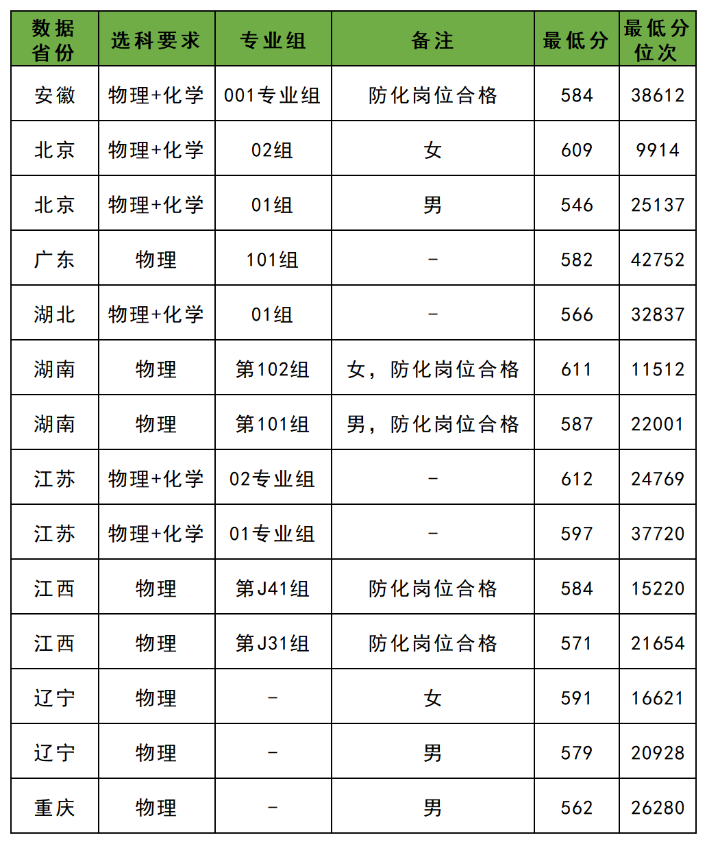 如2025年陆军防化学院在安徽省物理类招生最低分为584分。在北京招生最低分为546分。
