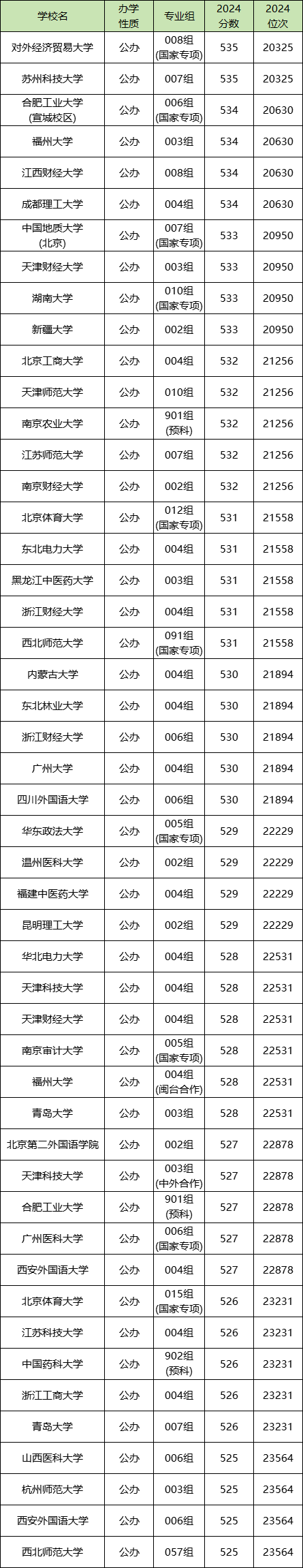 2024年甘肃物生地530分左右能上苏州科技大学007组(535分)、浙江财经大学006组(530分)、西北师范大学057组(525分)等院校专业组。