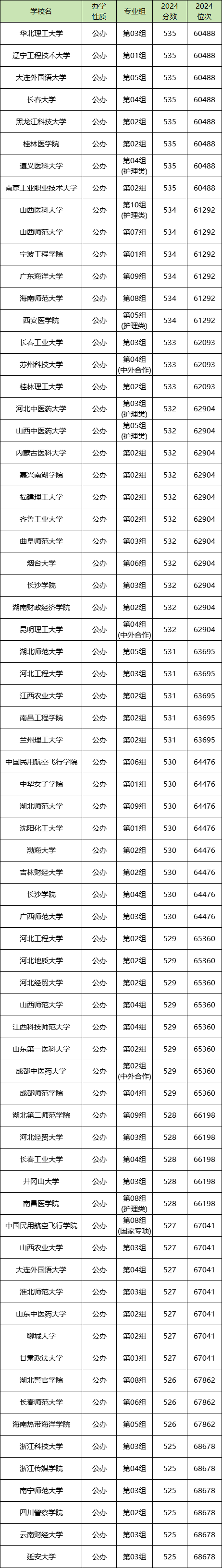 2024年湖北物生地530分左右能上华北理工大学03组(535分)、广西师范大学03组(530分)、延安大学03组(525分)等院校专业组。