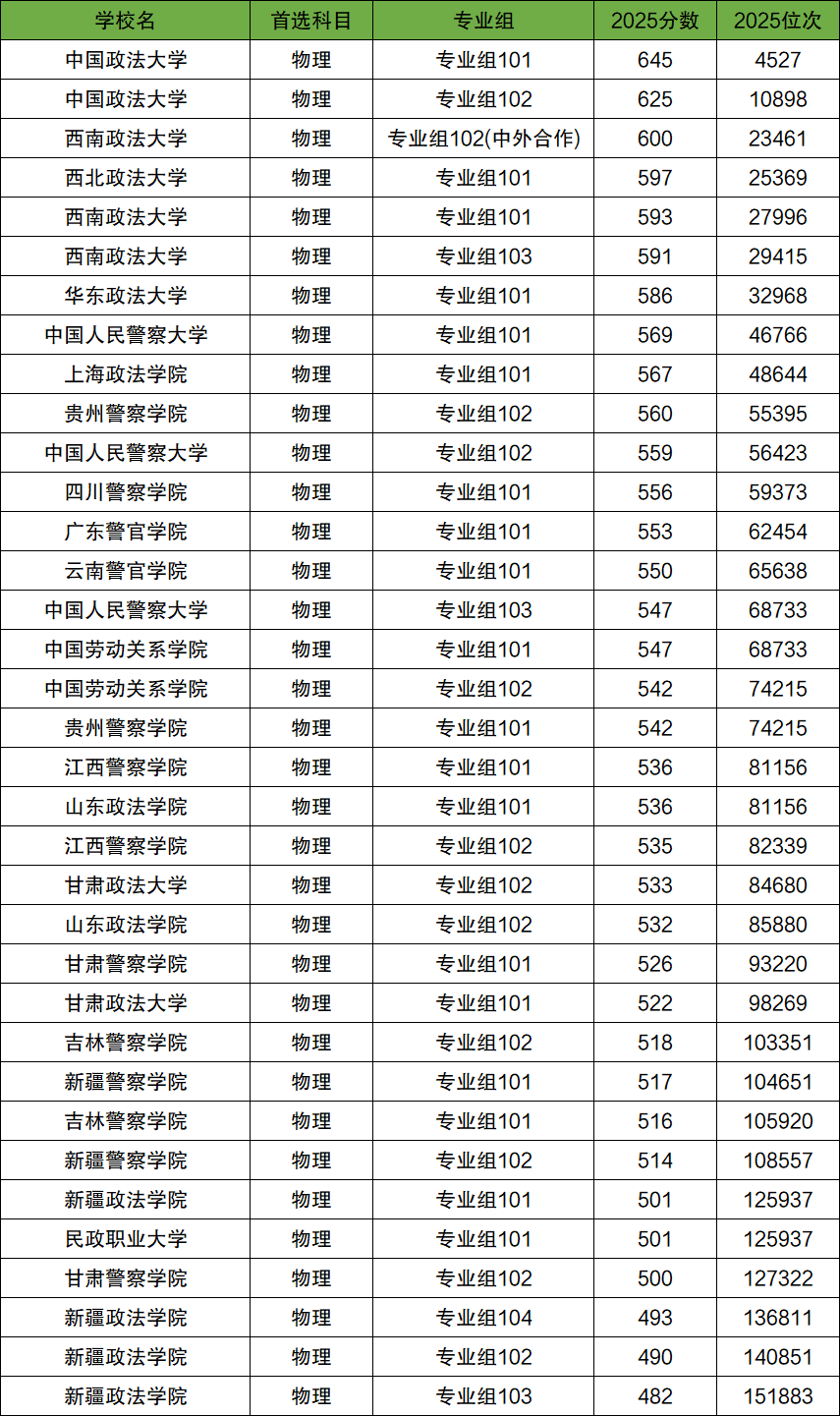 2025年四川物理类政法大学院校分数线排名一览表如下:
