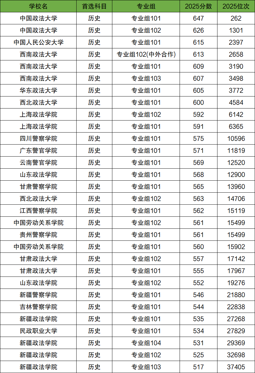 2025年四川历史类政法大学院校分数线排名一览表如下: