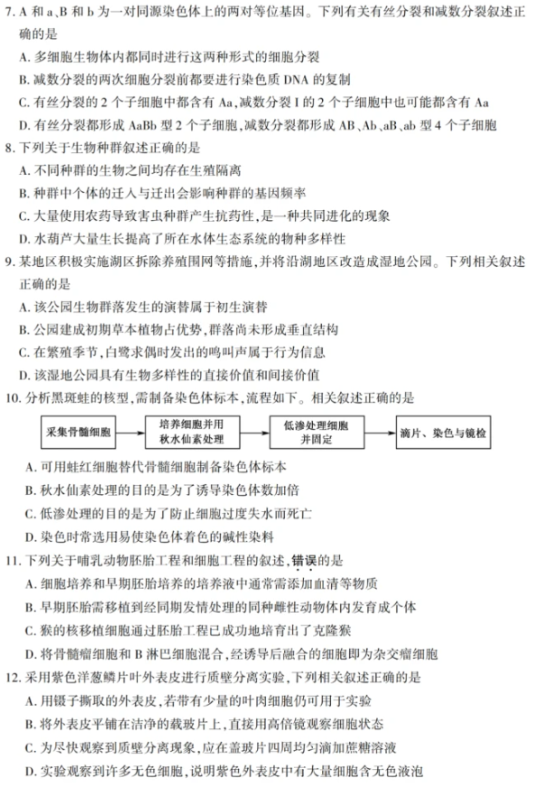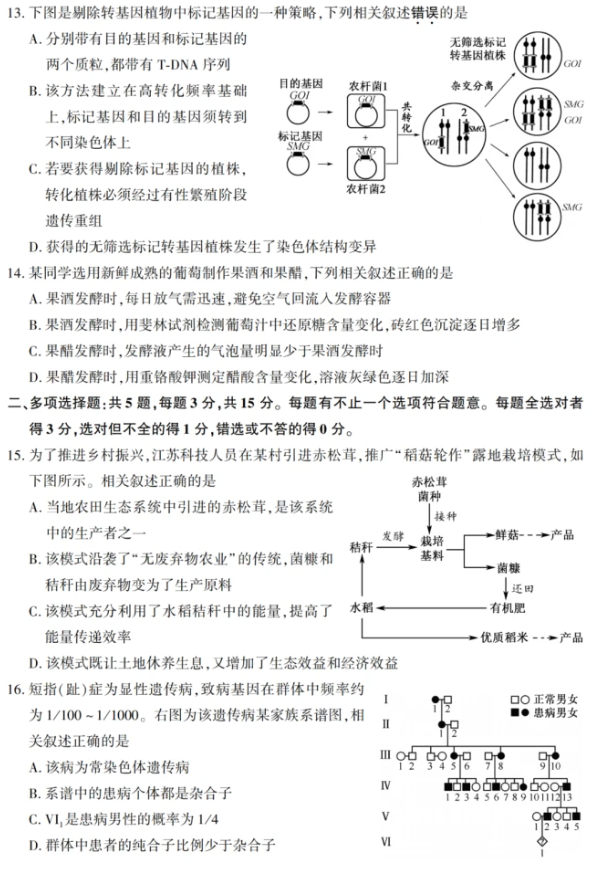 一. 2022全国高考江苏省生物试卷