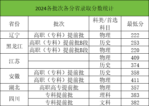 2024年长春职业技术学院专科提前批招生,各省最低录取分数线如下: