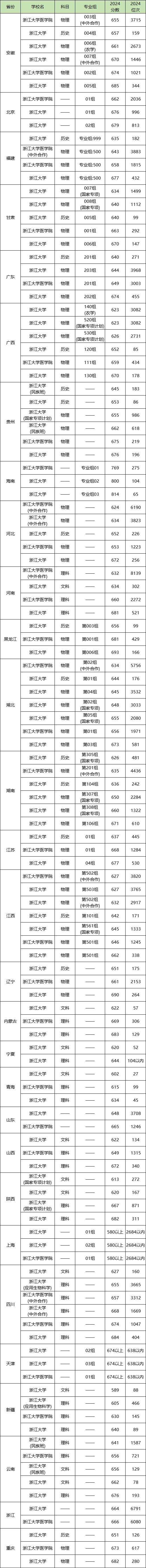 2024年浙江大学在各地区本科提前批的录取分数线如下: