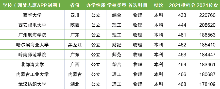 在广东省录取分数线最低的前八所大学中,分数线在433-468分之间,超过了本科线1-36分,而排名位次在178109-220760之间。