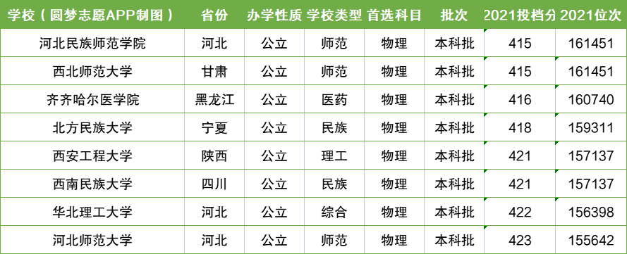 在河北录取分数线最低的前八所大学中,分数线在415-423分之间,超过了本科线3-11分,而排名位次在155642-161451之间。
