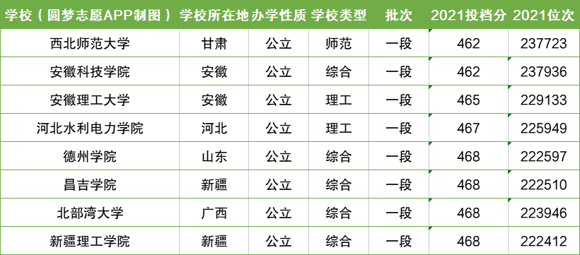 在山东录取分数线最低的前八所大学中,分数线在462-468分之间,超过了本科线18-24分,而排名位次在222412-237723之间。