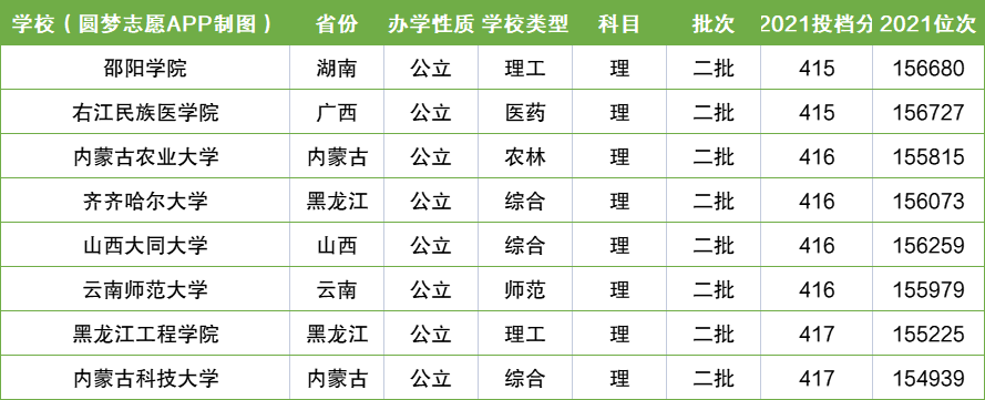 在安徽录取分数线最低的前八所大学中,分数线在415-417分之间,超过了本科线0-2分,而排名位次在154939-156680之间。