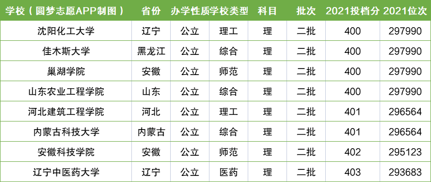 在河南录取分数线最低的前八所大学中,分数线在400-403分之间,超过了本科线0-3分,而排名位次在293683-297990之间。