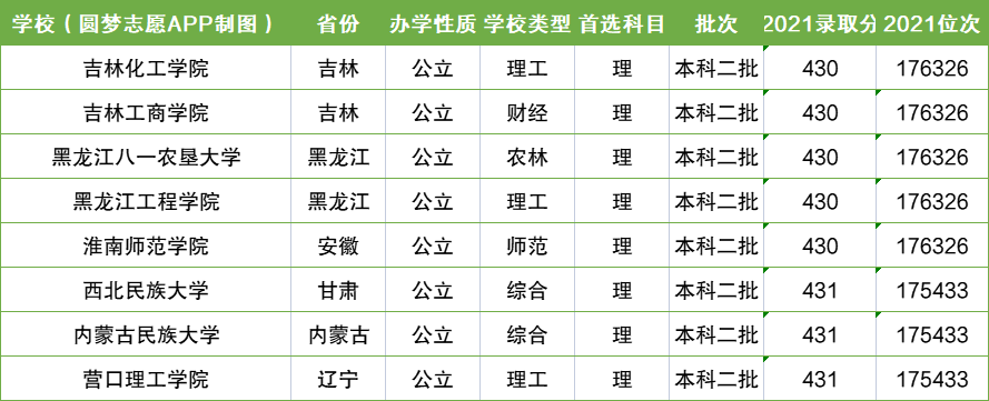 在四川录取分数线最低的前八所大学中,分数线在430-431分之间,超过了本科线0-1分,而排名位次在175433-176326之间。