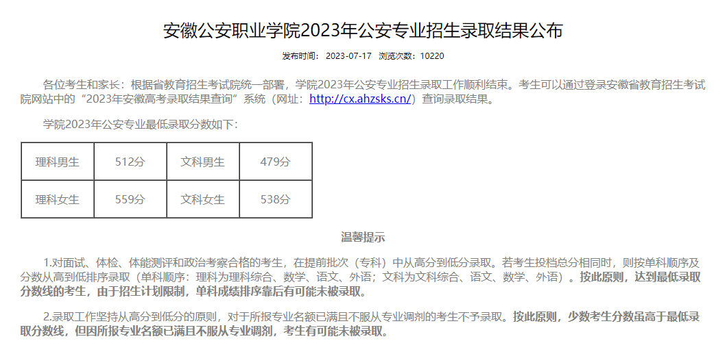 因此下文也为大家整理来了该警校公安专业2023年在安徽省内招生的录取分数:理科男生最低录取分数为512分、女生559分;文科男生最低录取分数为479分、女生538分。
