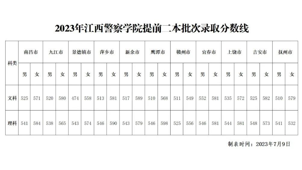 江西警察学院在提前二本批次的公安专业均按照分市招生,首先是南昌市,文科男生最低录取分数为525分、理科541分,文科女生最低录取分数是571分、理科584分;其次在九江市,文科男生最低录取分数为520分、理科538分,女生文科最低录取分数580分、理科565分。萍乡市文科男生报考江西警校的录取分数最低,分数线为474分。